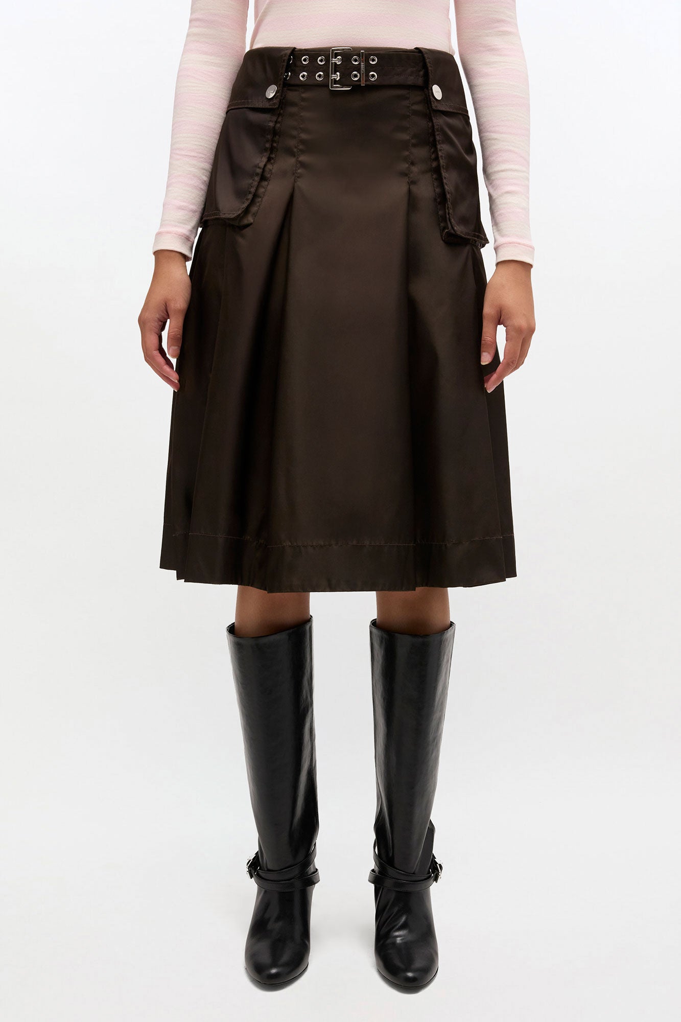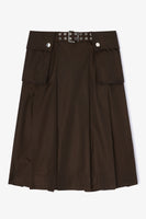 Denna kjol har två påsydda fickor med knäppning och en bred midjeresår med bältes detalj.