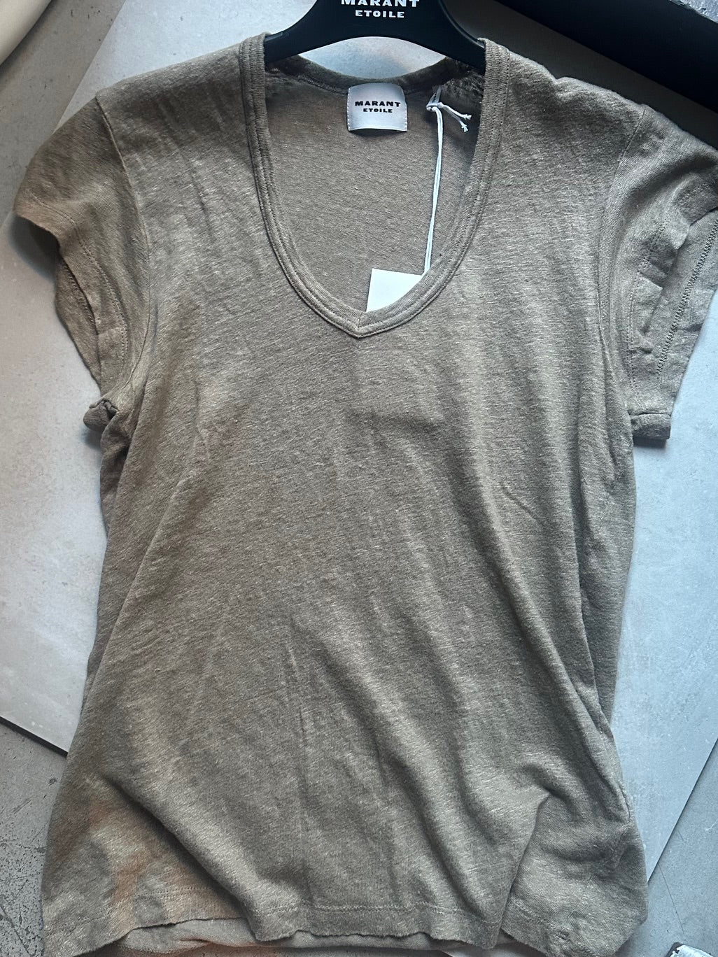 Lightweight plain-colored linen T-shirtV-necklineShort sleevesRelaxed fit