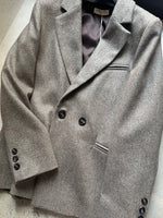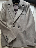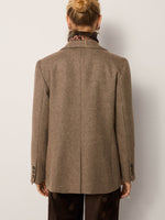 The herringbone wool in grey/brown color tones creates depth and texture in a blazer that feels timeless. Double-breasted front, sharp lapels, and tailored edges carry weight and refinement without stiffness.