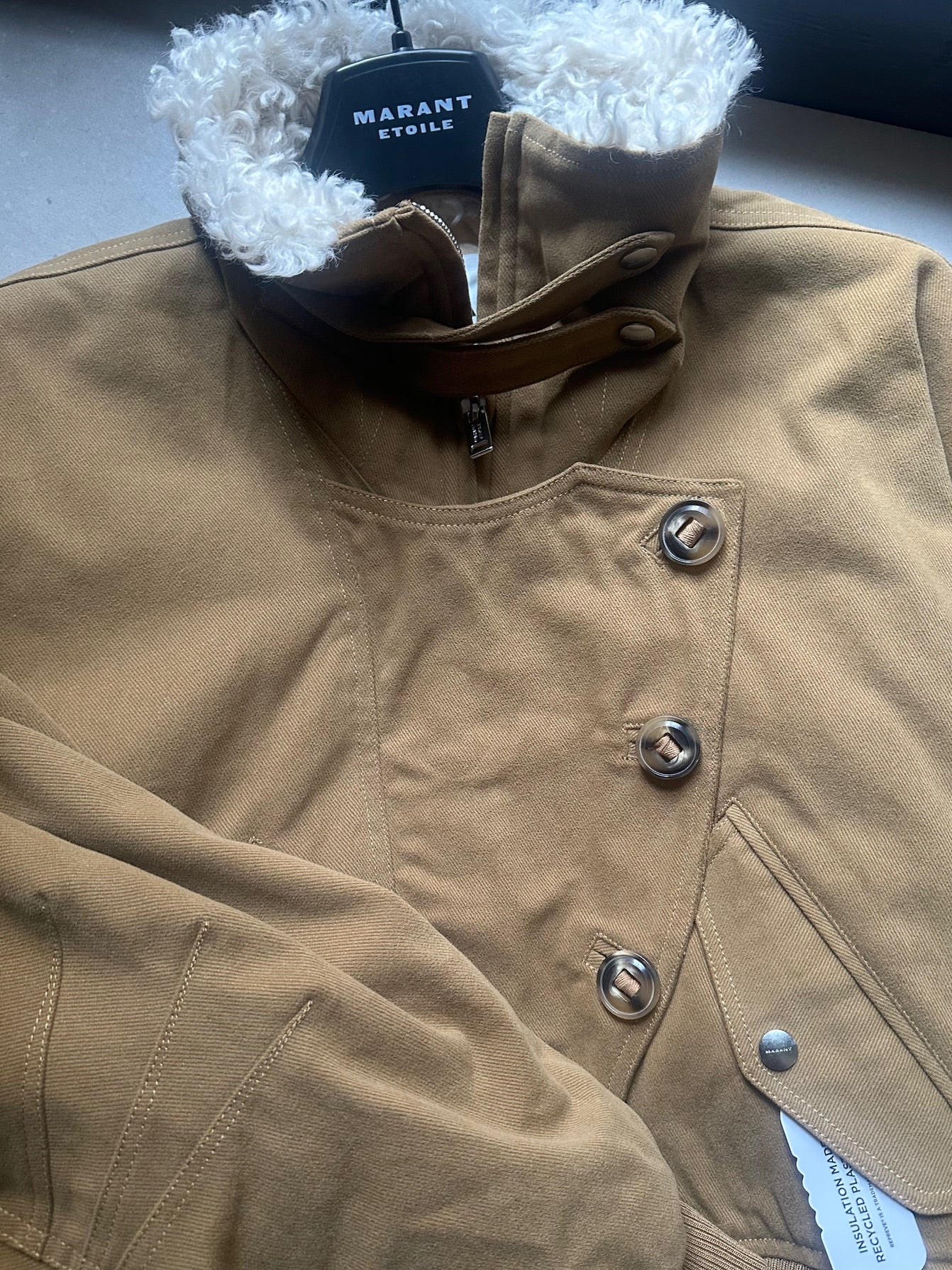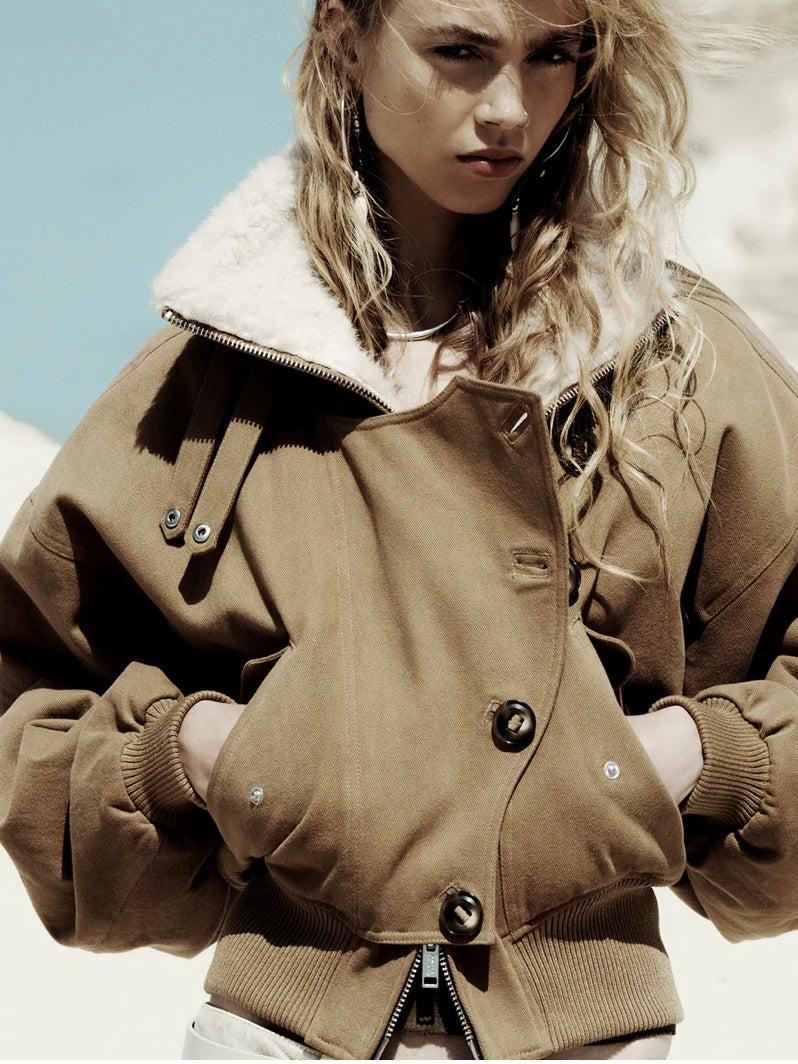 Bouclé feel faux fur-lined stand-up collar with retention tab